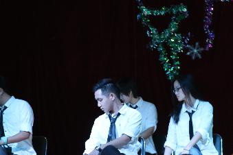 而全场最大的高潮莫过于中间的互动环节,导员的参与引爆了全场的热情,大家都为老师的积极参与喝彩。而这个环节中最大的看点在于惩罚环节,各种搞怪惩罚让人捧腹。而即使面对导员,我们的同学们也没有放弃竞争,两位老师也爽快地接受了惩罚。最后的节目为歌曲串烧,《樱花草》、《justone,lastdance》《花海》、《我的滑板鞋》、《万物生》、《知足》、《相亲相爱》等轮番登场,或浪漫温馨,或轻快悠扬,或搞笑做怪,或激情昂扬。最终,整个晚会也在导员的讲话中落下帷幕。