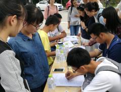 活动开始前,科协负责人们拉好横幅,贴好地贴,以起到扩大宣传效应的作用。并事先准备A,B,C三种答卷,题目难度递增,正确率高的同学可以获得精美礼品。精美的礼品、有趣的题目吸引了大批同学参与其中,活动现场热闹非凡。随后,在工作人员的带领下,答完题的同学纷纷在横幅上签名留念,短短的时间内横幅上就写满了名字,充分体现出同学们对环境保护的深切关注。