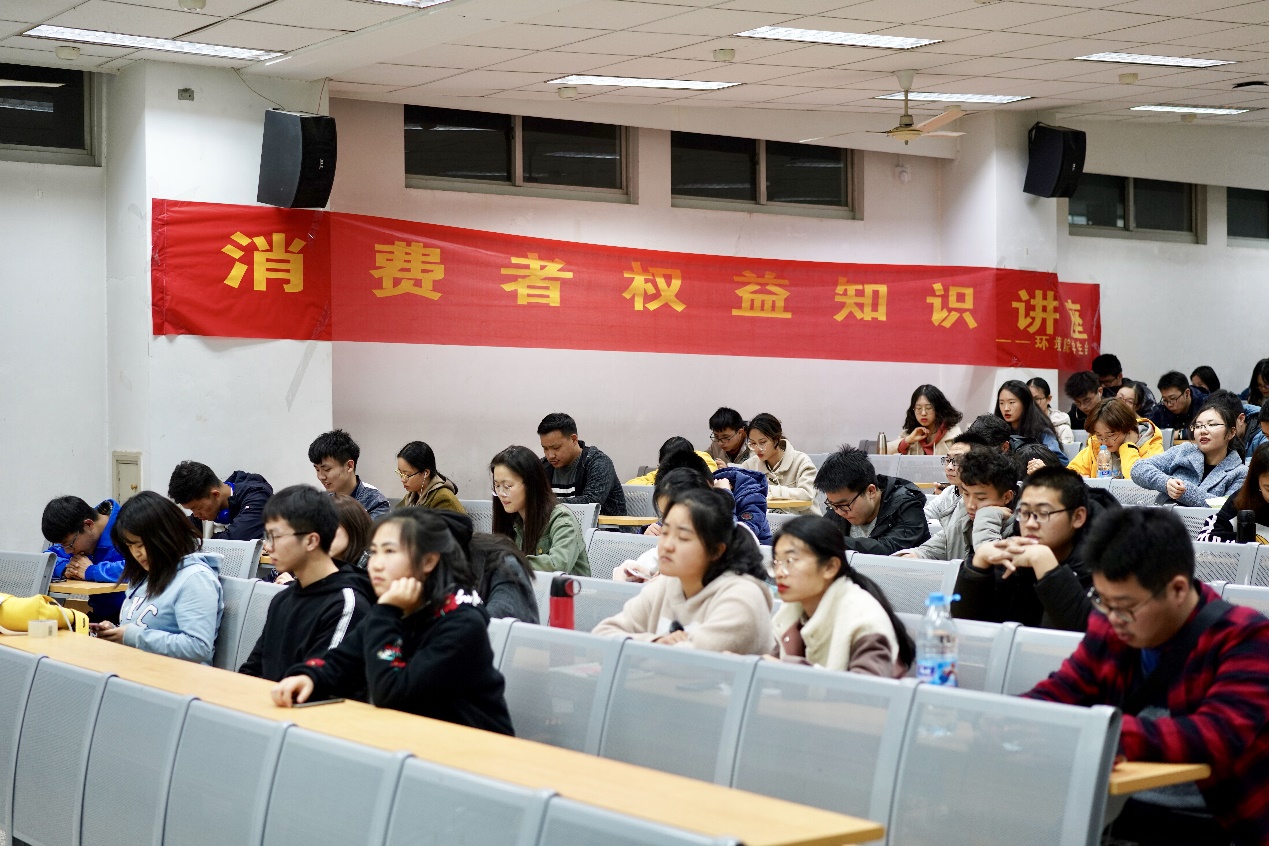 正值3.15消费者权益日,讲座现场座无虚席。身处中国这个消费大国,同学们对消费者所享有权益缺少全面的了解,对消费者如何最大化地保障自身权益缺乏系统化的知识普及。本次讲座目的在于向同学们普及消费者九大权益的内涵,介绍基本的维权渠道与方式。6时30分,讲座准时开始。首先,由陆美娜同学向我们介绍消费者权益保护的意义和相关的法律法规,并强调了保护消费者权益的重要性,让同学们对消费者权益有了基本的理解。